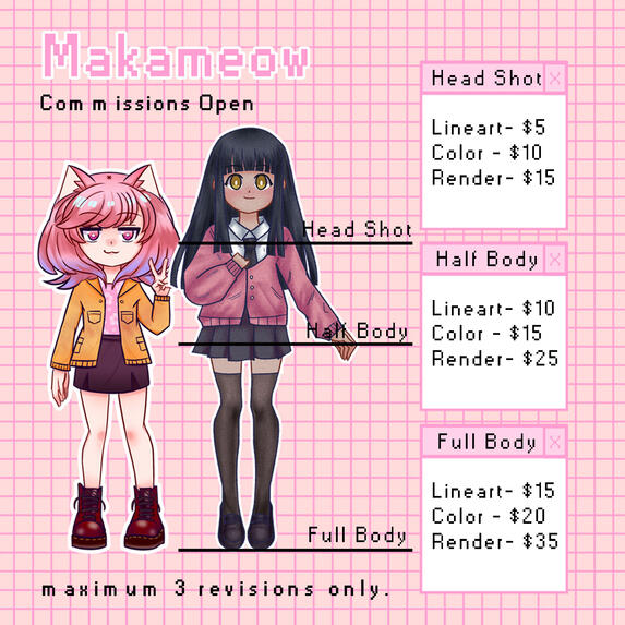 Payment✦The artist will send invoices via Paypal or via Ko-Fi.✦All prices are in USD, it is required to pay 50% downpayment to start the commission. You can also pay in full.✦If the work has not started yet, it is allowed to ask for a refund. If the work has started, it is not allowed to ask for a refund.✦The artist will offer a refund if the artist is unable to complete the commission due to circumstances.✦Donations will be only accepted via Ko-Fi. Do not donate after you've paid via Paypal invoice for commissions.